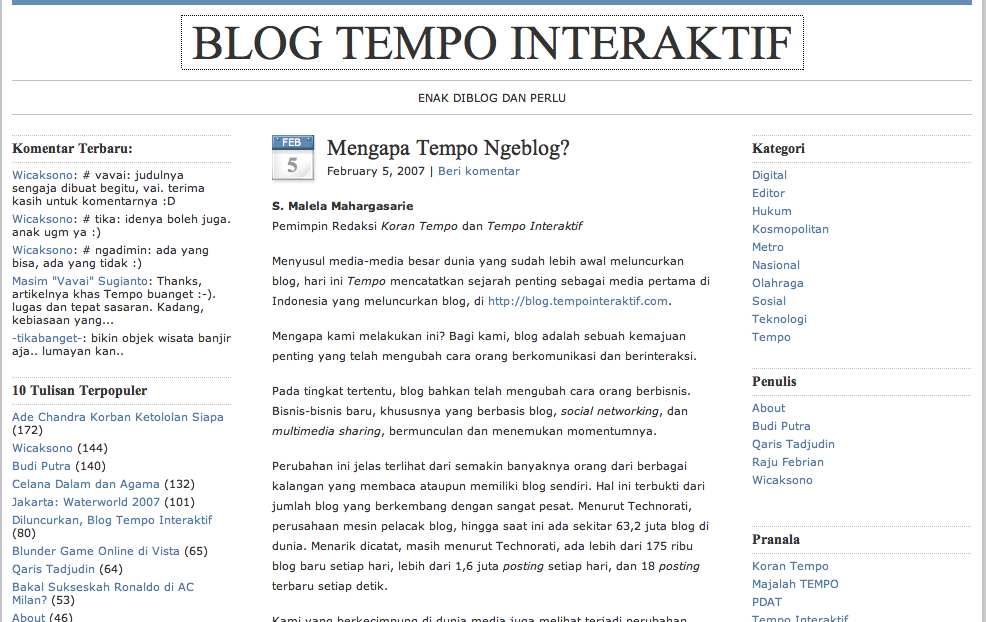 In the posting to kick off the blog, the editor for Koran Tempo and Tempo Interaktif S. Malela Mahargasarie explained that Tempo was getting into blogs because they have changed the way people communicate and interact. Tempo, said Malela, wants to get into conversations with its readers because they have found, for instance, that the choices of the editors are not really what the readers expect or want to read about.