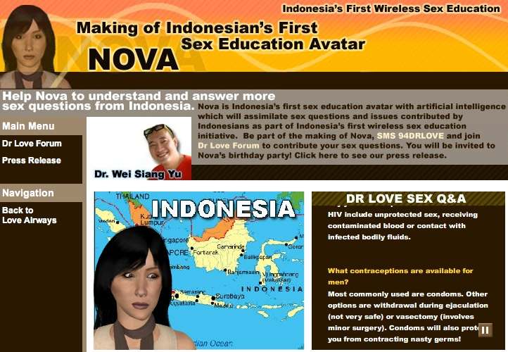 Nova, says Dr Love‘s website, “is Indonesia’s first sex education avatar with artificial intelligence which will assimilate sex questions and issues contributed by Indonesians as part of Indonesia’s first wireless sex education initiative.” Question: Does this mean that if many Indonesians contribute we’ll have a Super Nova? (sorry, couldn’t resist the bad pun).