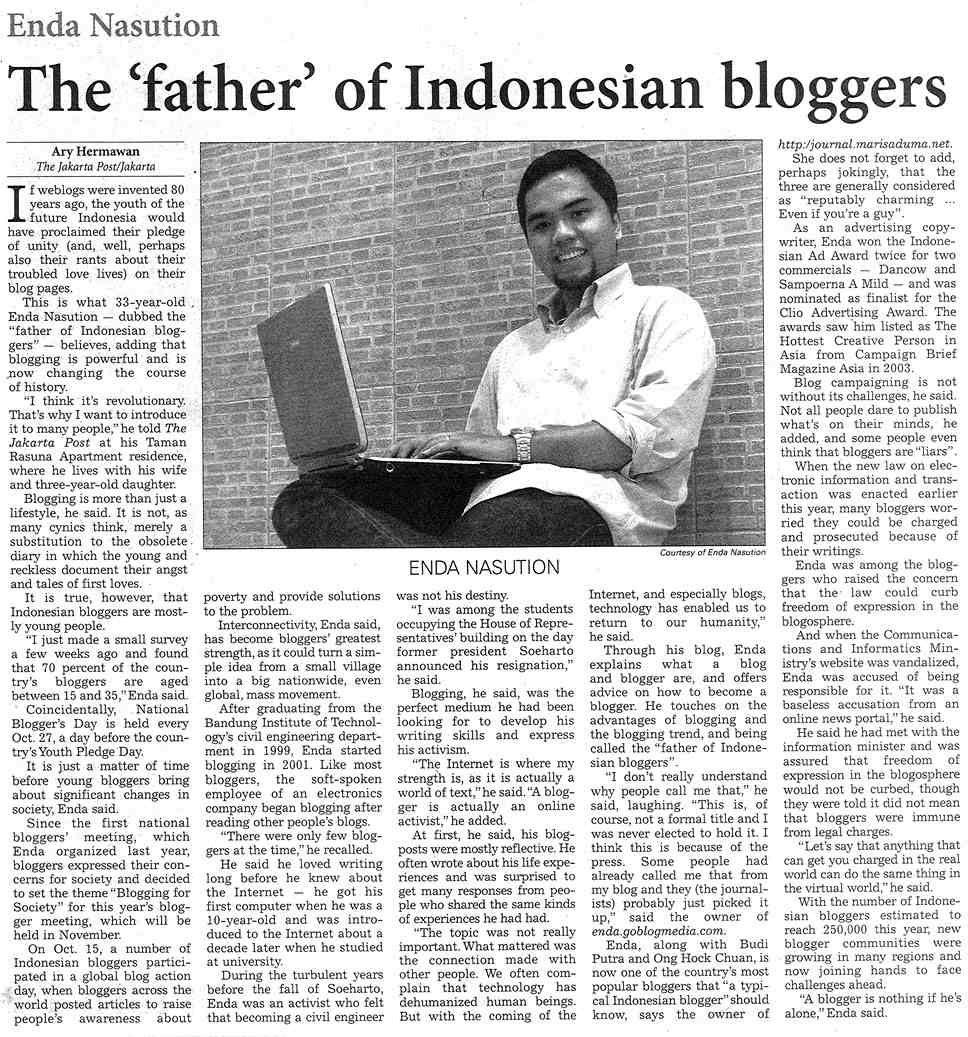 The Jakarta Post did a write up on “Bapak Blogger” Enda Nasution today. The interview was conducted because yesterday was National Bloggers Day, proclaimed by Minister of Communication and InInformatics Muhammad Nuh at last year’s Pesta Blogger. Good to see the ole’Post giving serious coverage to blogging and bloggers, especially in the run up to Pesta Blogger 2008.