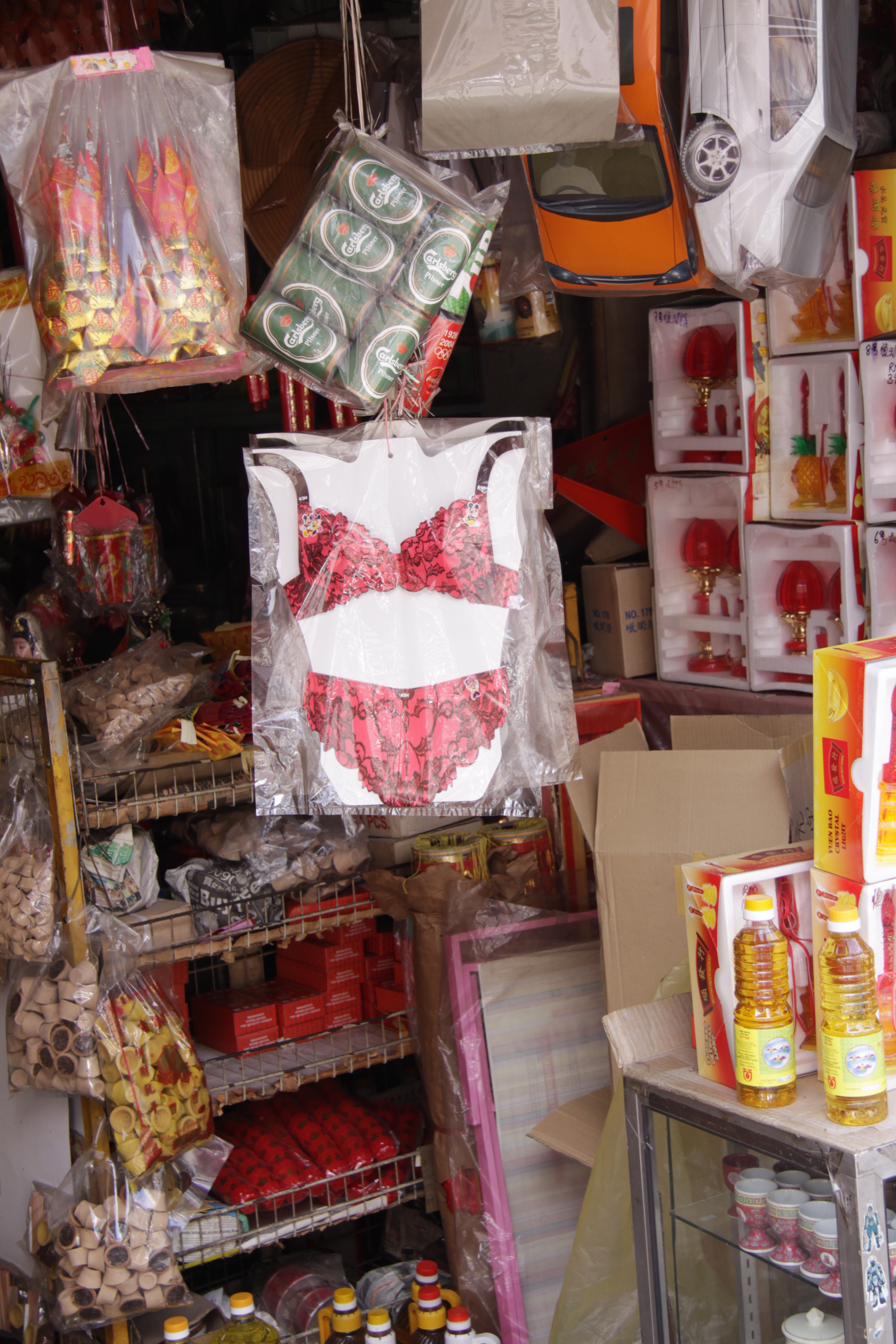 Unspun was, however, still struck by the novelty of it all when he and Loved One came across this shop near Malacca’s famous Cheng Hoon Teng Temple and its shopfront display of sexy underwear for the dead. Doesn’t this make you wonder what kind of a relative would buy such merchandise for their dearly departed (and what sort of character she must have been when alive. Granted could be a He at which case…kinky!)?