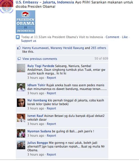 The US Embassy made an announcement of this Facebook app on Facebook this morning and it looks like the appeal has struck a chord, or rather the stomachs of many Indonesians. So far there are 609 comments and rising….