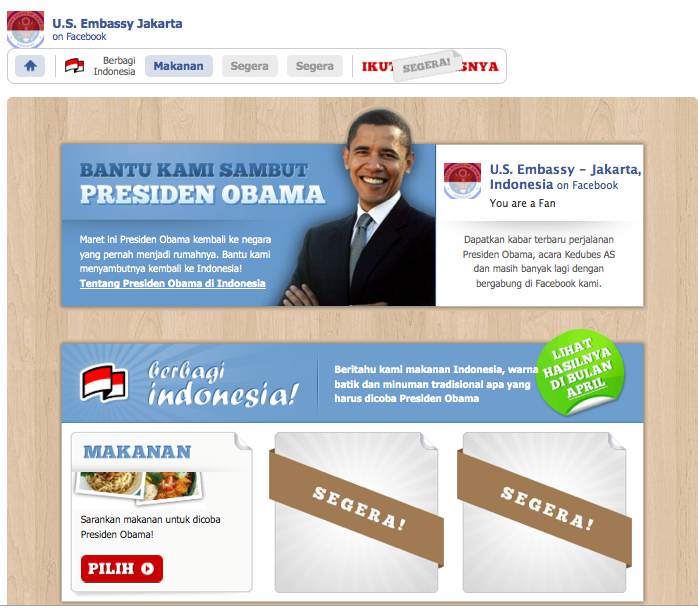 If your like most of the Red-and-White-to-the-core Indonesians Unspun knows you probably have some strong ideas about which Indonesian food is best. If so join in the fun at the US Embassy’s facebook app and make your suggestion for Barry’s menu.