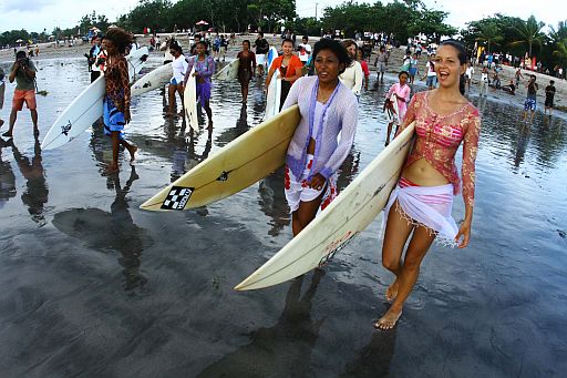 Almost a fashion show: Dozens of female surfers ride on the waves in Javanese long-sleeved kebaya blouses Sunday for the Kebaya Surf Culture Exhibition on Kuta beach, Bali. The event was held to commemorate Kartini Day, which falls on April 21. JP/Zul Trio Anggono