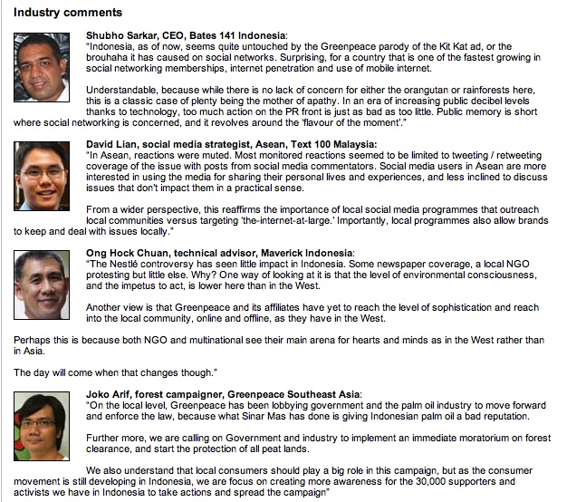 Nestle harvested a storm of protests in the West when it mishandled the Sinar Mas issue on social media. Yet it got away relatively scott free in Asia, or so the industry voices including Unspun’s alter ego think in this article in Media: