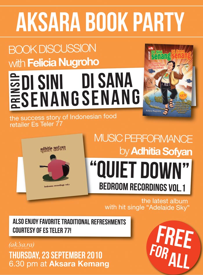 Aksara is throwing a book party tonight for Felicia Nugroho, who recently published her biography of her father, the late colorful and enterprising Sukyatno Nugroho. The title of the book is Prinsip Di Sini Senang Di Sana Senang and recounts the life of Sukyatno from his childhood in Pekalongan to various daunting challenges and failures before he founded Es Teler 77, one of Indonesia’s earliest local fast food franchises that is also one of the largest today.