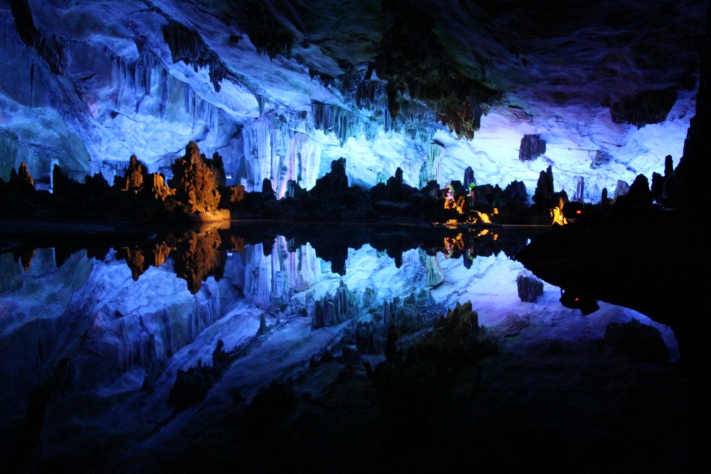 In and around Guilin are several attractions. We went to Reed Flute Cave, about 20 minutes drive from the town center. It’ a huge cave complex with all sorts of limestone formation that the overworked Chinese imagination throughout the ages have identified as shapes resembling everything from lions to stage curtains and Kuan Yin. Some of the lighting was quite well done and in the main chamber we came across this: