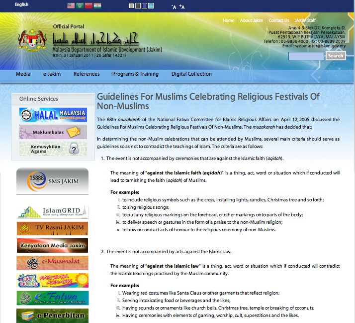 Below is apparently the latest directive from the Malaysian Department of Islamic Development titled Guidelines for Muslims Celebrating Religious Festivals of Non-Muslims.