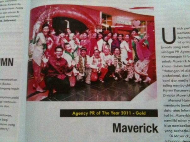 In addition three of Maverick’s clients, in which we played a supporting role in their PR efforts, also won awards. They are: AXIS (Silver award) for its Menang Bareng Campaign under the Marketing PR category; the US Embassy in Jakarta (Silver Award) for berbagi Indonesia, a campaign to welcome President Obama; and, perhaps ironically, the embattled Mandala Airlines (Gold Award) for its Issues Management as it sought to restructure the airline.