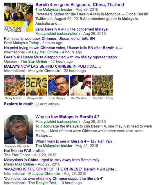 What’s interesting is how one major threat of the conversation about Bersih 4 is going. And it’s all about race. There are those that say that most of the protesters in Kuala Lumpur are of Chinese descent, and that those of Malay descent were under represented. (But I do a disservice to the Malaysian nomenclature – careful phrasings of Chinese descent, ethnic Chinese and ethnic Malays are all abbreviated into Chinese and Malays).