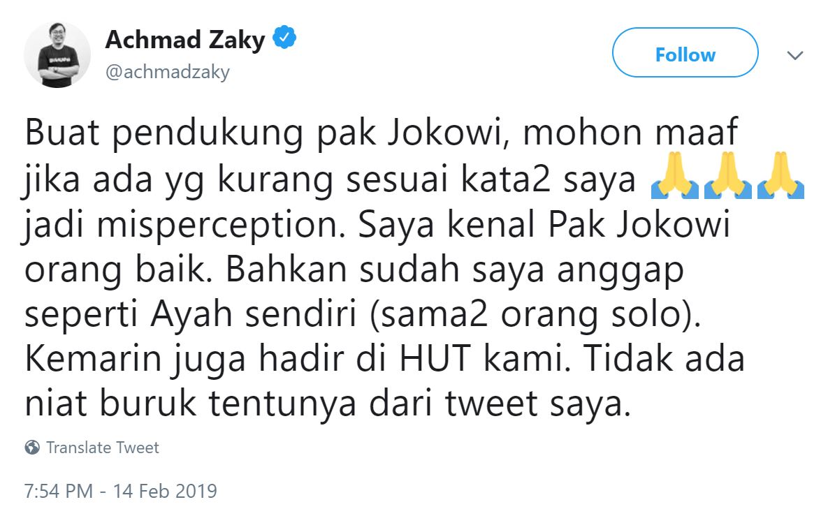 This Tweet caused a Tweetstorm from Jokowi’s supporters using the hashtag #uninstallbukalapak They feel particularly betrayed because Jokowi recently graced Bukalapak’s anniversary celebrations and appeared side-by-side with Zaky before the Press.