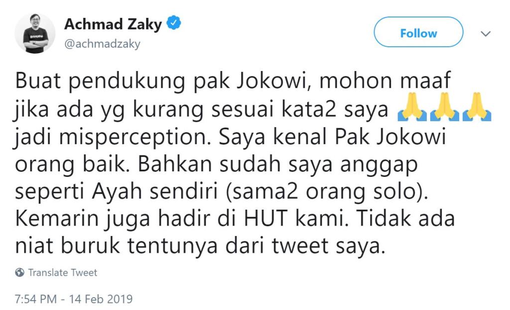 He then tried the maaf word, but here again it was a non-apology apology. “Sorry to Jokowi’s supporters if there was anything amiss in my words has caused any misconceptions. I know Jokowi as someone who is good whom I consider like my own father (we’re both from Solo). Recently he visited us at our anniversary. There is certainly no ill will in my Tweet.
