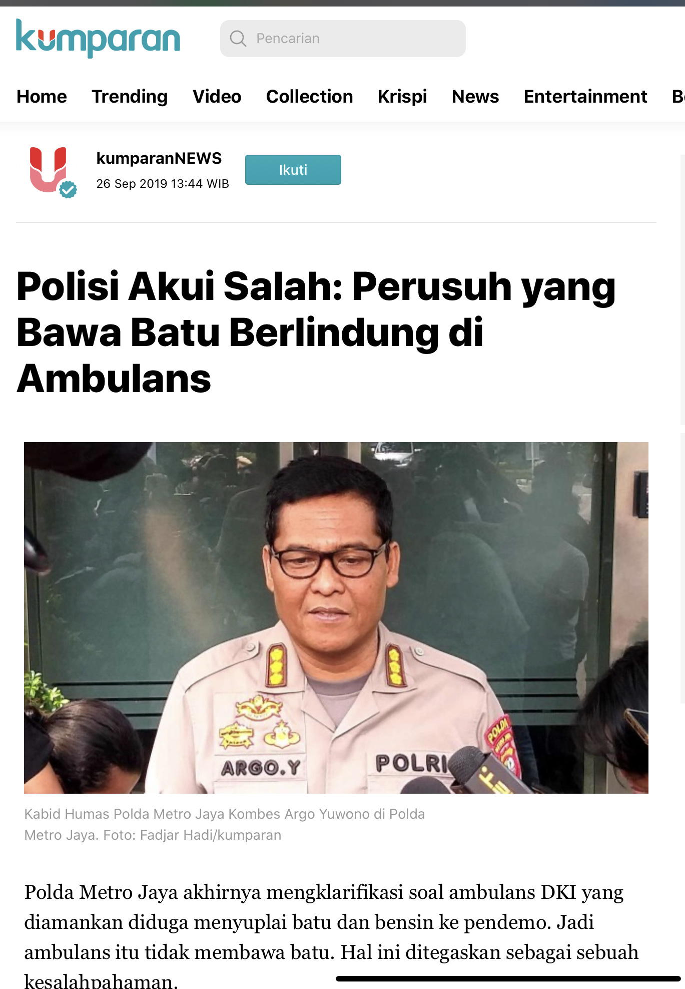 Later today Polda Metro Jaya spokesman Argo Yuwono said that there was a misunderstanding. The ambulance (or ambulances – it is not clear) were not, as the Police initially suspected, ferrying rocks and Fireworks to rioters.