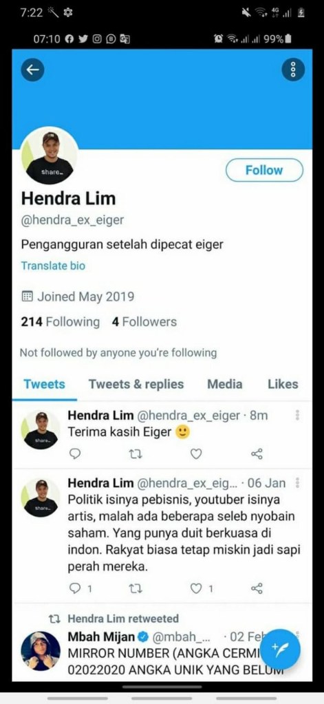 Hendra, however, seems unable to stop shooting himself on the foot, lamenting in a twit that politics between businesses, artistes and YouTubers and virtually the whole world is conspiring to keep The People poor and heap blame on them.