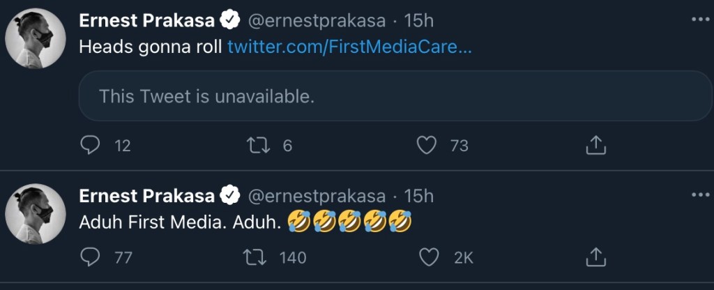 The posting attracted the attention of Uber influencer Ernest Prakarsa who simply commented: “Aduh. First Media. Aduh.”