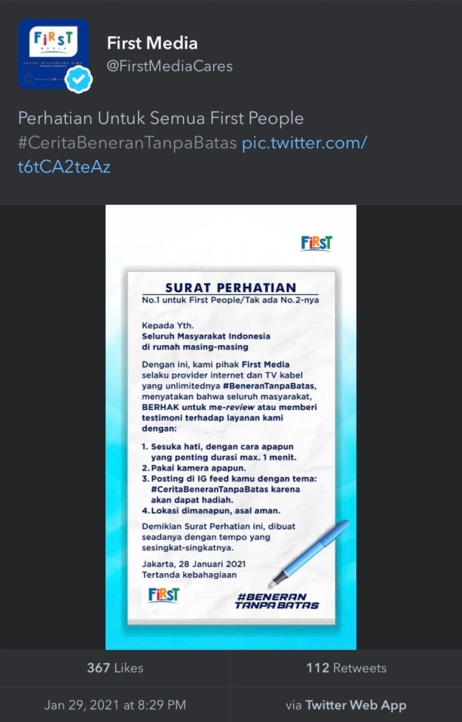At about 10pm First Media social media admin thought they’d be clever and ride on the Eiger letter fiasco that earned the ire of Indonesian netizens.