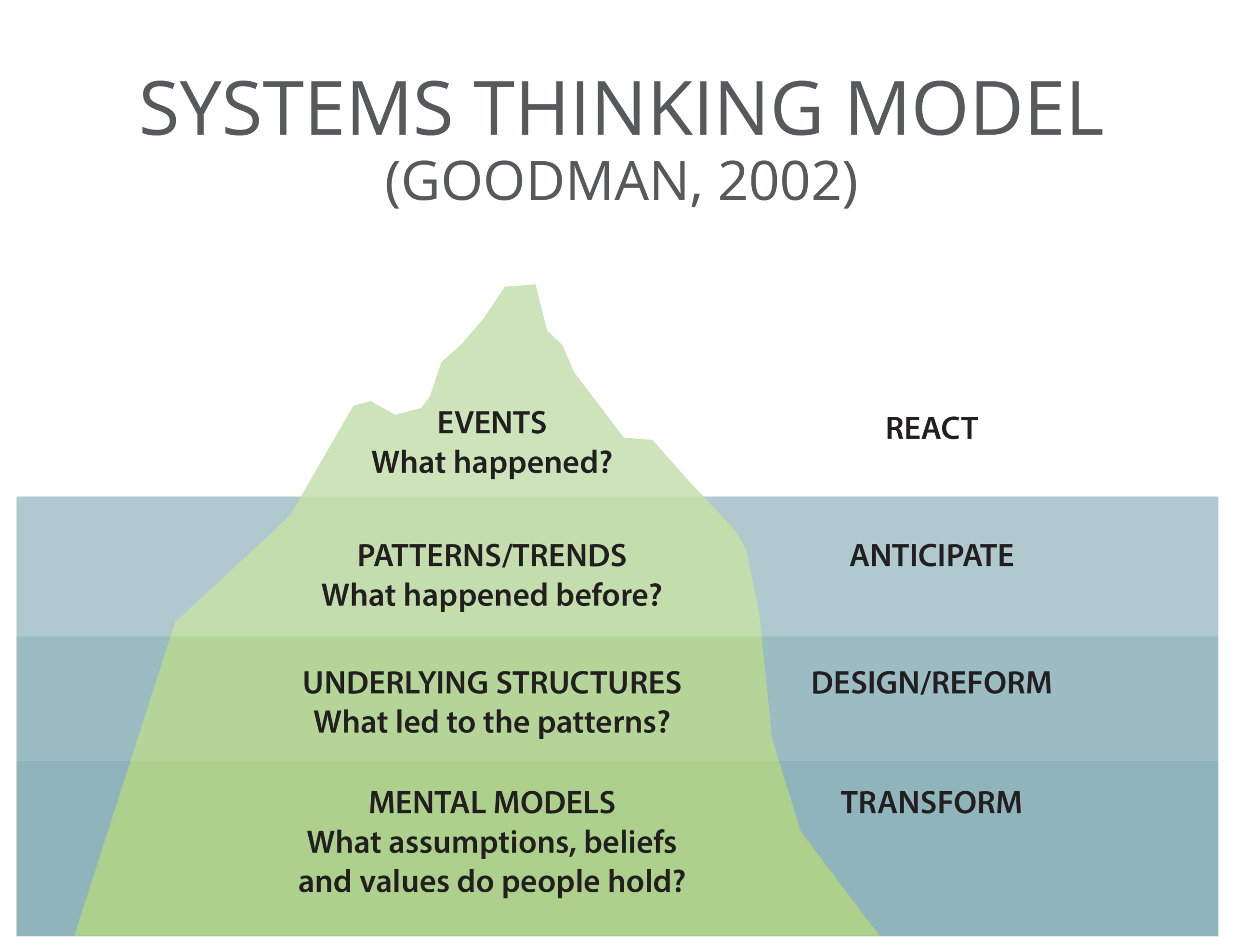 A Systems Thinker, however, would see it differently. They would, for instance, employ the Iceberg Model to dive under the surface and look for interconnectedness between such events (ostentatious displays of wealth) with patterns of behaviour, underlying systematic structures and mental models to see how they can have a holistic and sustainable solution to the situation.