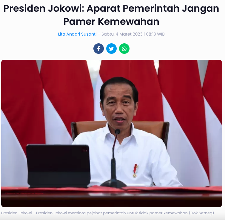 Take, for example, the responses of Indonesia’s leaders to the Rafael Aurel Trisambodo case. Rafael, a Director General in the Tax Department, as we know, was outed as a tax dodger and most likely venally corrupted person when his son beat a 15-year old senseless. The boy’s friends exposed the son’s ostentatious display of wealth on his social media accounts and started a chain reaction which saw public outcry, the incarceration of the son and dismissal of Rafael.